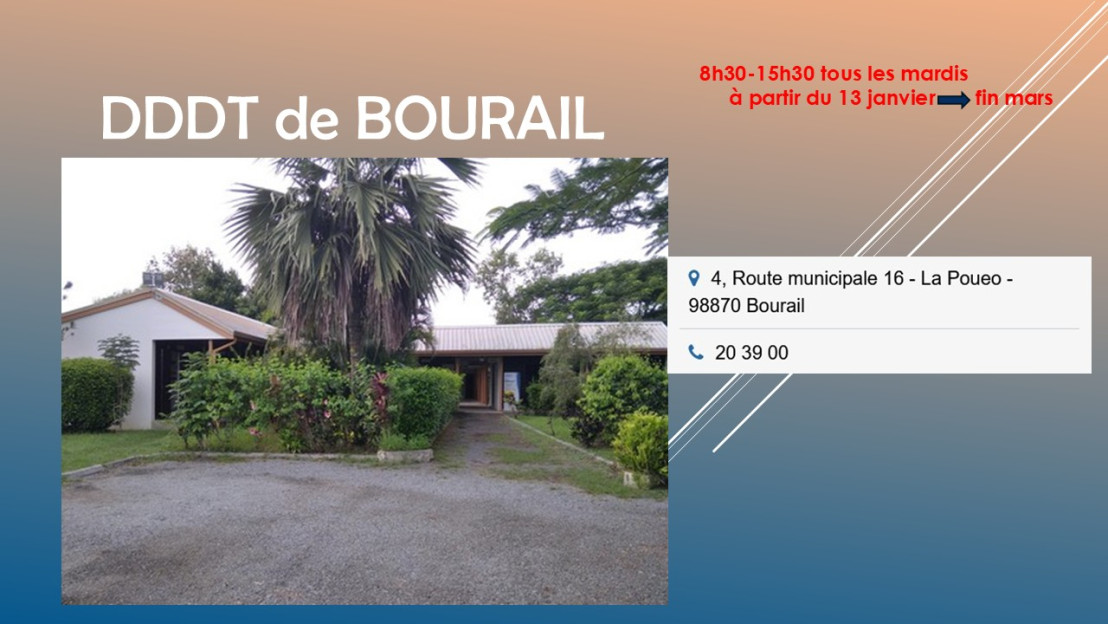 Ouverture/fermeture des bureaux au 14 Rue de l'Alma-Noumea et zone Kataviti KONE: du lundi au jeudi de 8h00 à 16h30 en continue. Le vendredi de 8h00 à 15h30. tel: 285/785